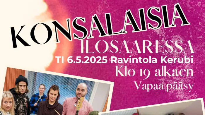 Konsalaisia Ilosaaressa -ilta tuo Kerubin Saliin kolme paikallista yhtyettä, jotka ovat Holy Cowbell, Randevuu ja Kaapo Kekäle. Salin ovet auki klo 19, ja konserttiin on vapaa pääsy.