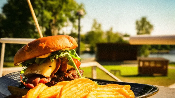 Härkä-aurajuustoburgeri ja maustetut maalaisranskalaiset (VL)