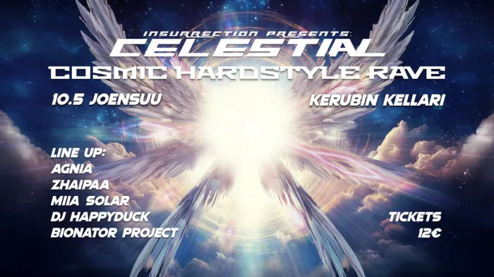 Lauantaina 10.5.2025 Kerubin uudistettu Kellari muuttuu galaktiseksi tanssilattiaksi, kun Celestial saapuu Joensuuhun. Ilta on täynnä järeää hardstyleä, euforista synterisaattoria sekä kosmista tasapainoa horjuttavaa menoa.