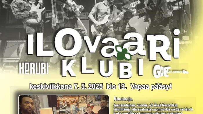 Ilovaariklubilla keskiviikkona 7.5. esiintymässä suomirockia soittava Routaraja, poppia ja rokkia veivaava Patalaiskat ja tuttuja biisejä eri vuosikymmeniltä coveroiva CaopyPaste. Ovet auki klo 19, konserttiin on vapaa pääsy.