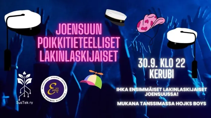 Tule todistamaan Joensuun ihka ensimmäisiä lakinlaskijaisia Kerubiin! Luvassa on ikimuistoinen ilta, jolloin lakit laitetaan talviteloille syyskuun viimeisenä päivänä kello 00.00. Nappaa siis kaverit ja teekkarilakki, YO-lakki – tai mikä tahansa lakki – mukaan ja tule juhlimaan! Illan tanssittaa legendaarinen Hojks Boys.