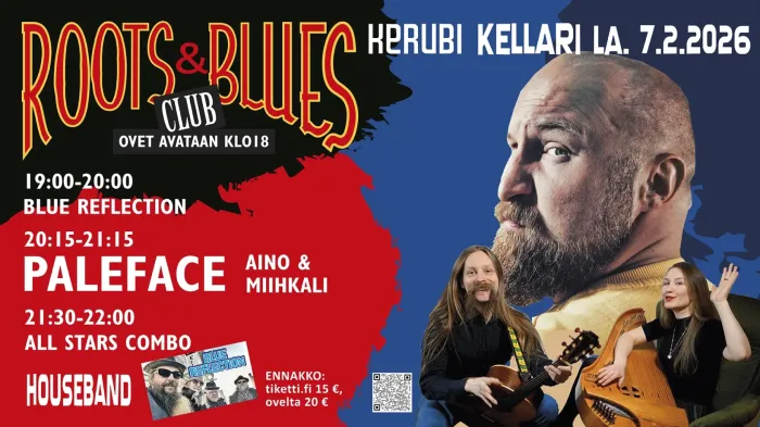 Joensuulaisen garage blues -yhtye Blue Reflectionin synnyttämä ja isännöimä Roots & Blues Club -ilta ihastutti lokakuussa 2025 juurevan musiikin ystäviä Kerubin Kellarissa, ja palaa jälleen Kellariin lauantaina 7.2.2026. Esiintymässä nähdään Paleface, Aino ja Miihkali sekä tsekin illan aikana esiintyvä Blue Reflection. Liput ennakkoon Tiketistä, ja niitä myödään myös ovella. Illan järjestää Blue Reflection -yhtye.